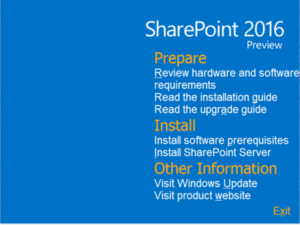 Installation of SharePoint 2016 IT Preview looks similar to previous SharePoint installations. When you mount the ISO, you will see a familiar splash screen.