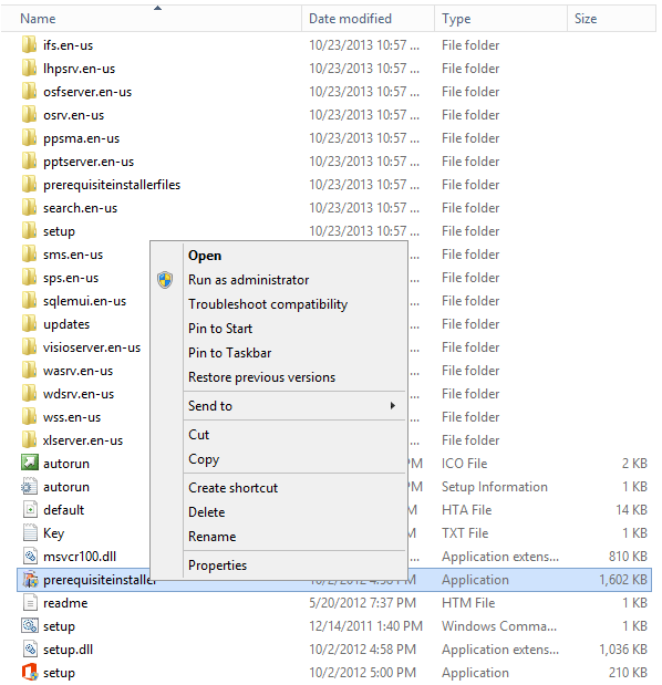 1. Go the directory where do you have your installation files, select the Prerequisite.exe file and run as Run as Administrator