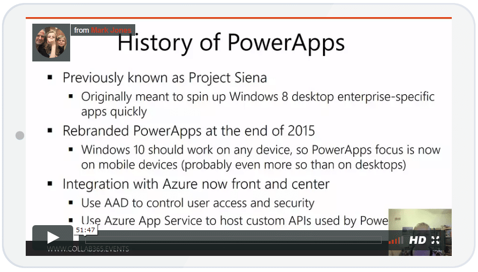 Becky Bertram builds on top of Alan's and Maarten's session (below) really well as she drills more into PowerApps and also covers licensing. Also check out How to build your first PowerApp.