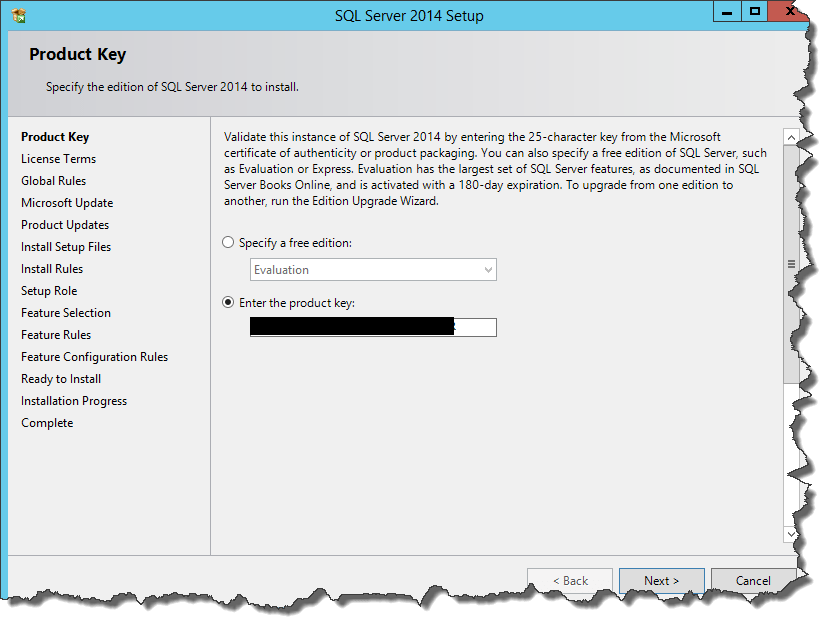 4. A new window “SQL SERVER 2014 Setup” appears on the screen which contains all of the steps required to complete the setup. Firstly, you need to validate the Product Key for your SQL server. Input a valid key in the text box as depicted below and click on the Next button.