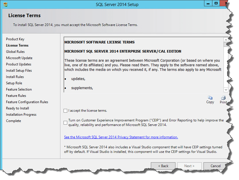 5. In the following License Terms screen, you have to accept the terms and conditions by selecting the checkbox on the screen. You can also select the checkbox for Customer Experience Improvement Program (CIMP) option for reporting errors to Microsoft SQL Server Team if you wish. Click on Next button to continue with the installation.