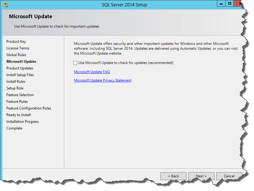 7. On the “Microsoft Update” screen you need to check for updates for SQL Server 2014 by selecting the checkbox. Make sure you have good internet connectivity to download and install the required updates. Click on Next button to move on.