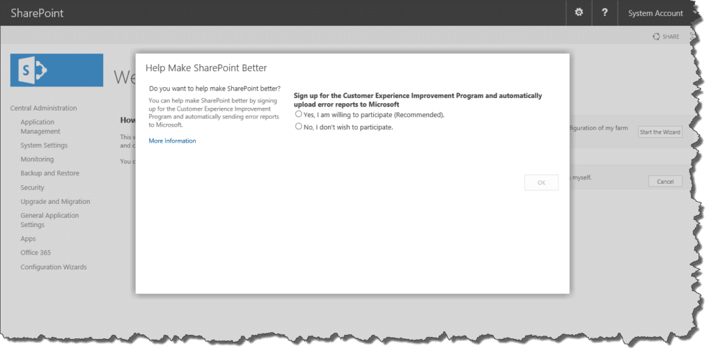 24. After immediate completion of configuration the SharePoint Central Administrator website gets opened with a child window asking whether you wish to participate in the Customer Experience Improvement Program. Select “Yes/No” option and click on the OK button to continue..